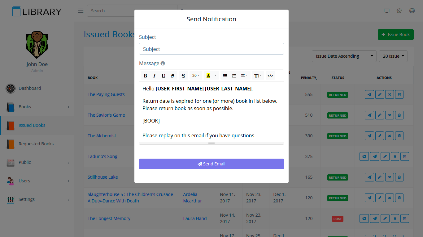 - sending email notification about late book return