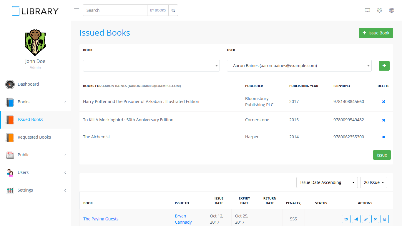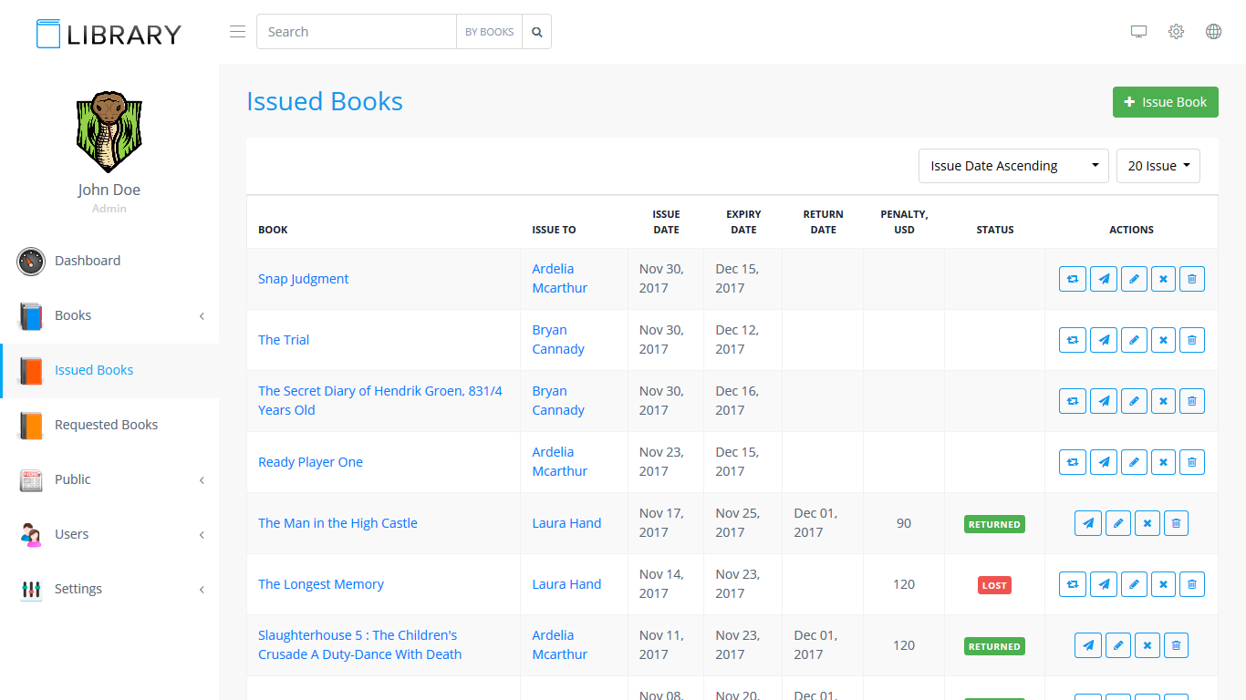 This section is for librarians. Librarian can manage and monitor book issues here. Following actions can be performed on this page: