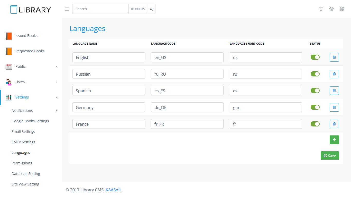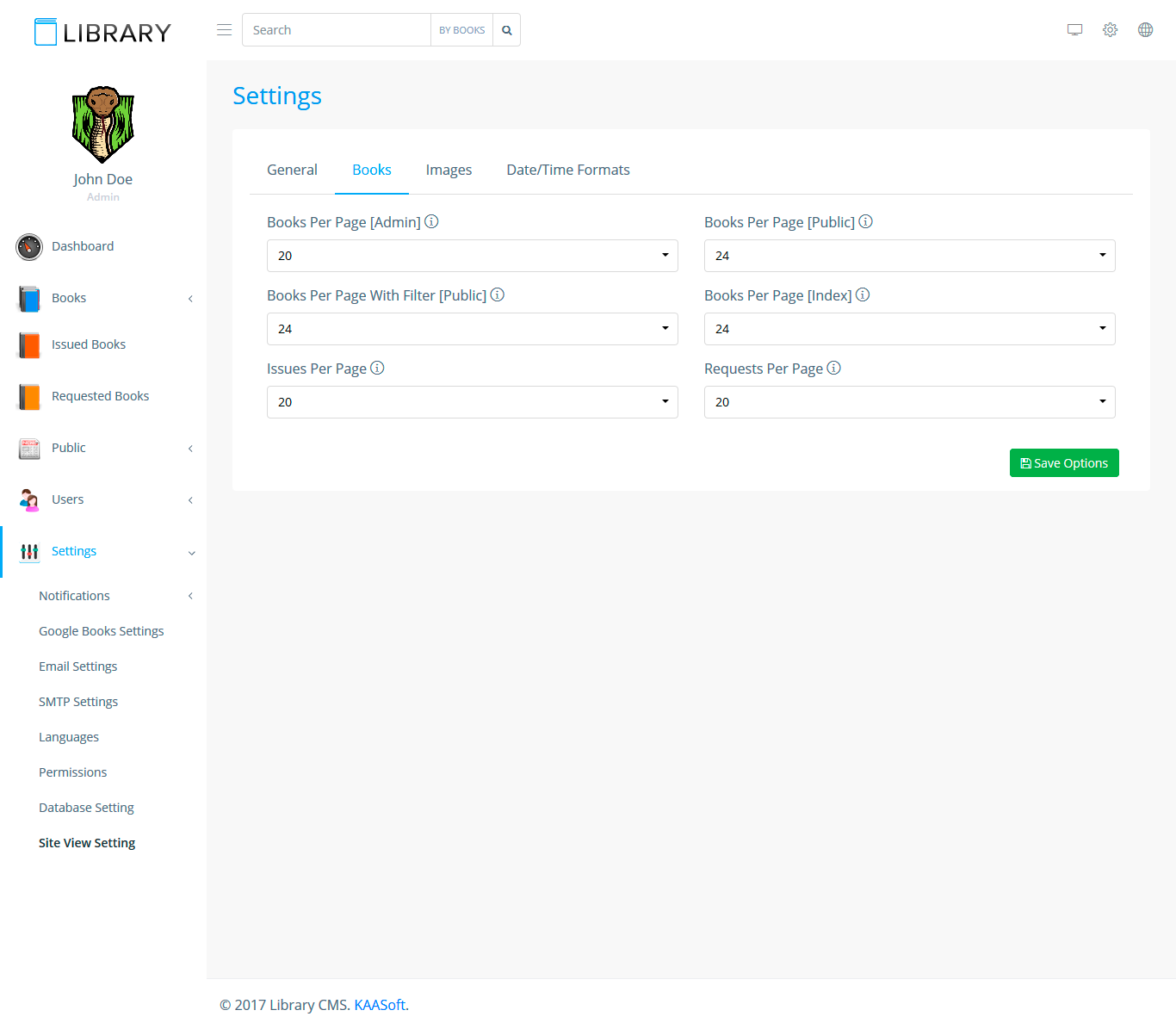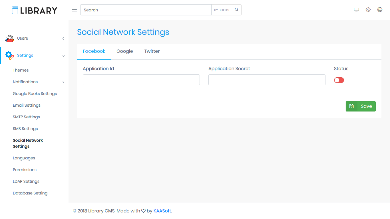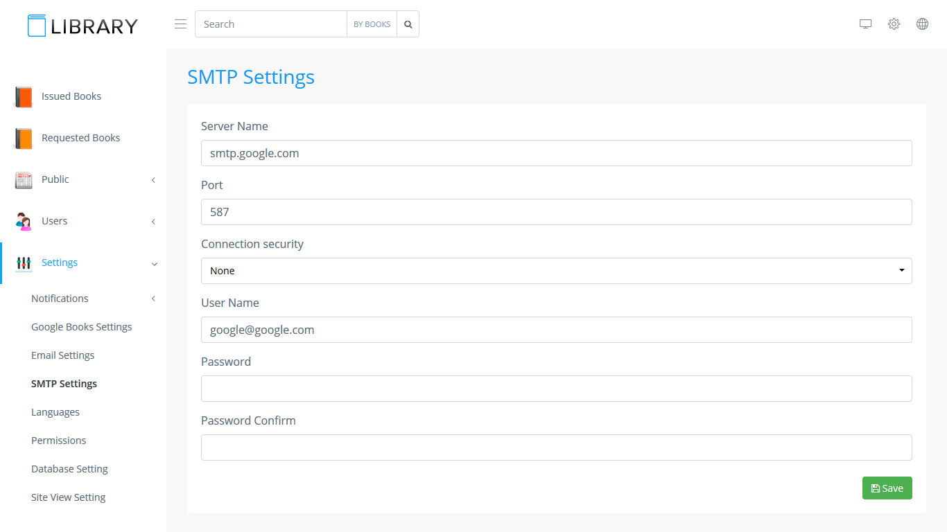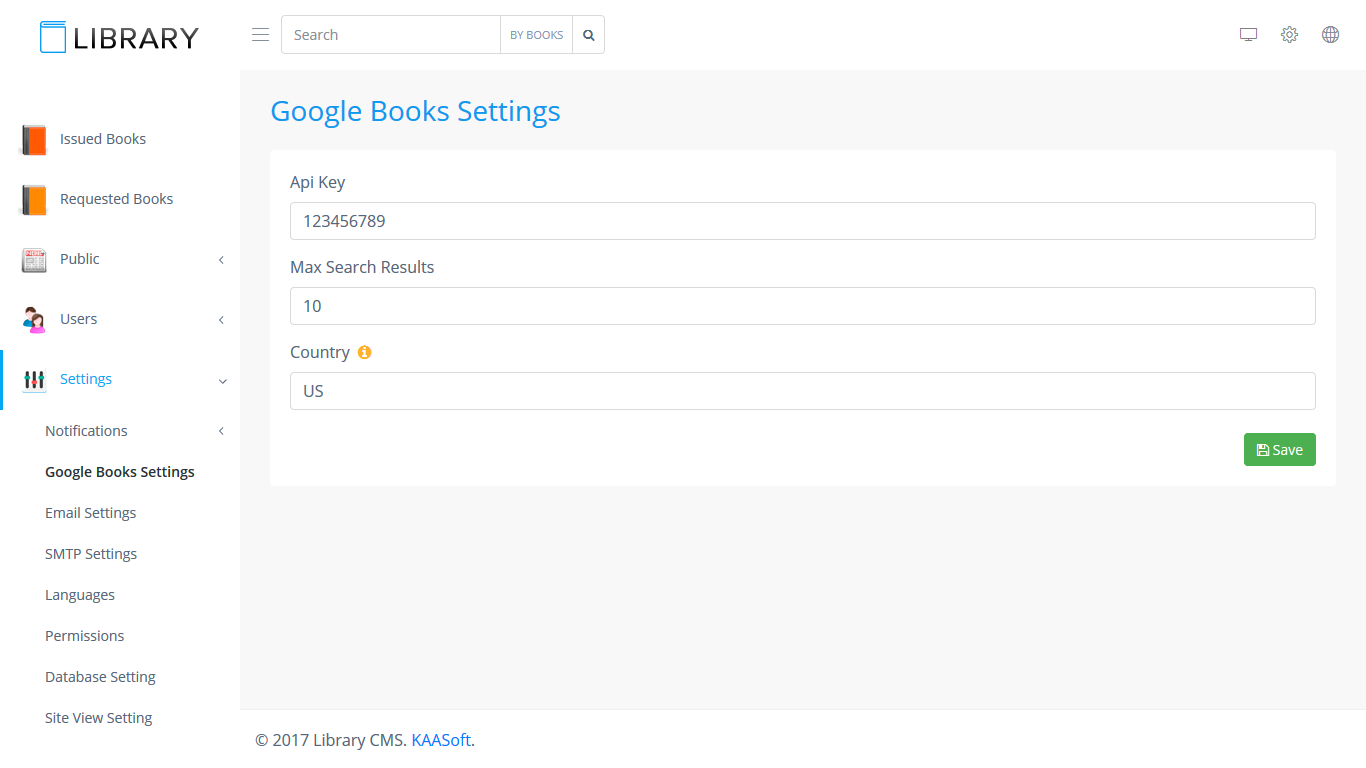 You can create new books by importing data from Google. Here should be specified setting for Google Books API. To use Google Books API you have to generate your own API key (see https://support.google.com/cloud/answer/6158862 about Setting up API keys).