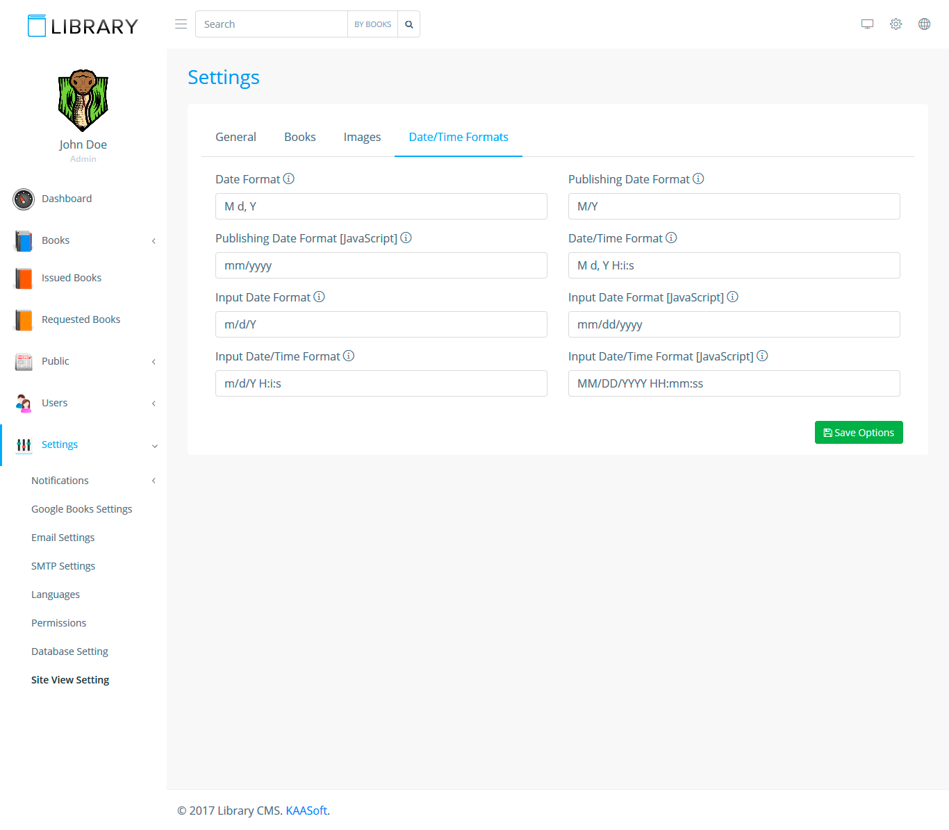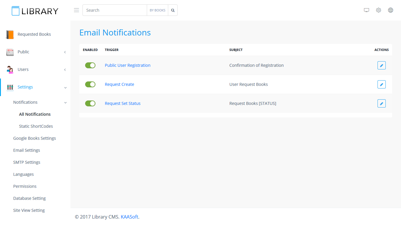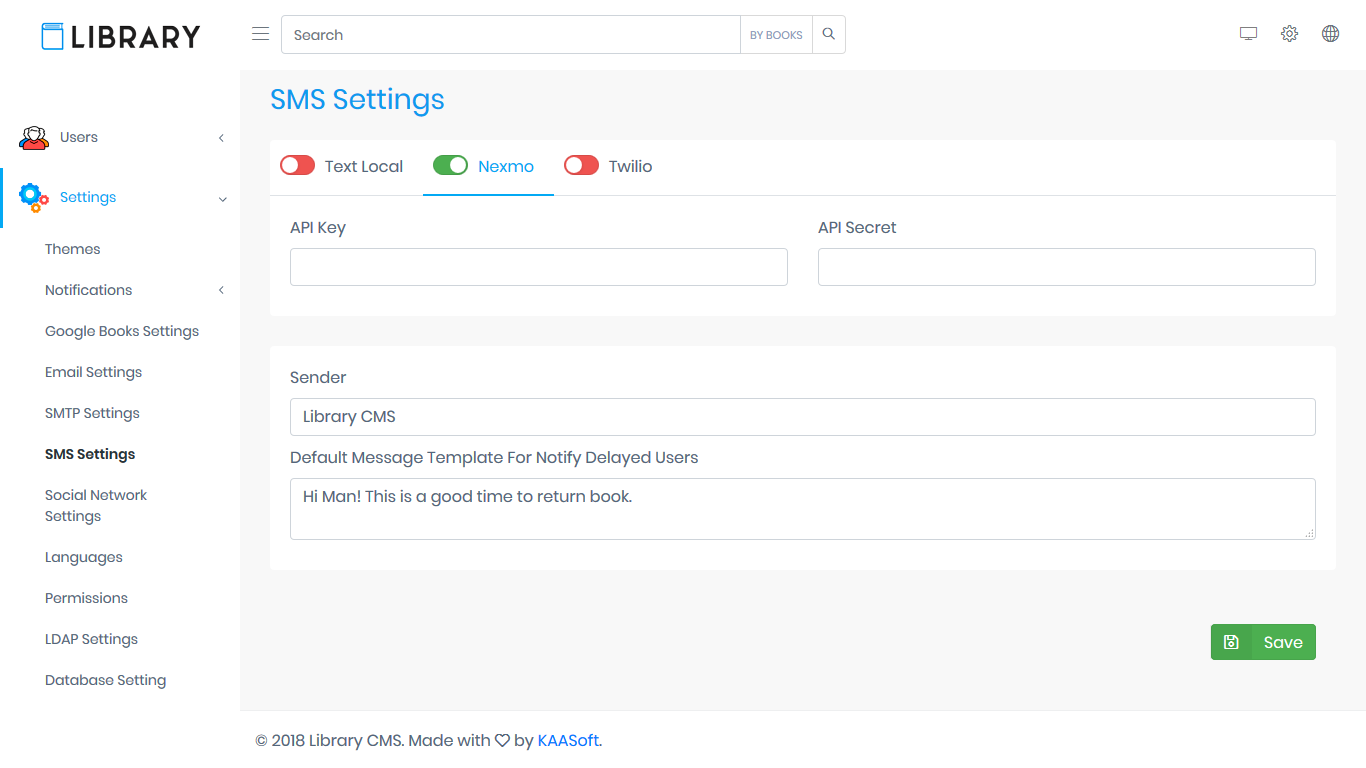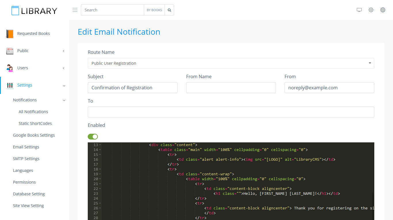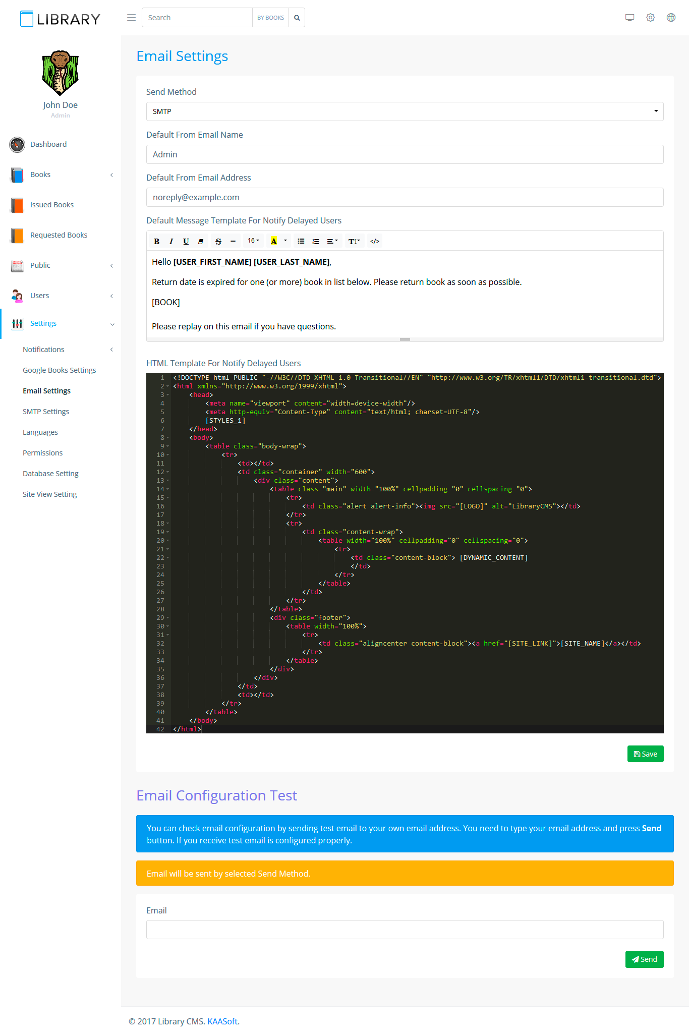 Settings include Sending Method (it can be SMTP or PHP Mail), default sender email and sender name, template of email to notify users who delayed books. You can see 2 templates: