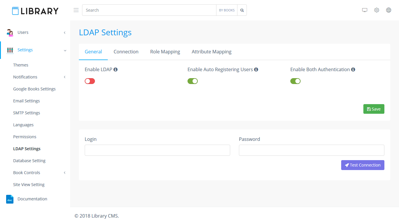 - integrated with usual database authentication. In this case database authentication has priority. It means user first of all will be searched in database and if it couldn't be found in database Library CMS will try to find it in LDAP.