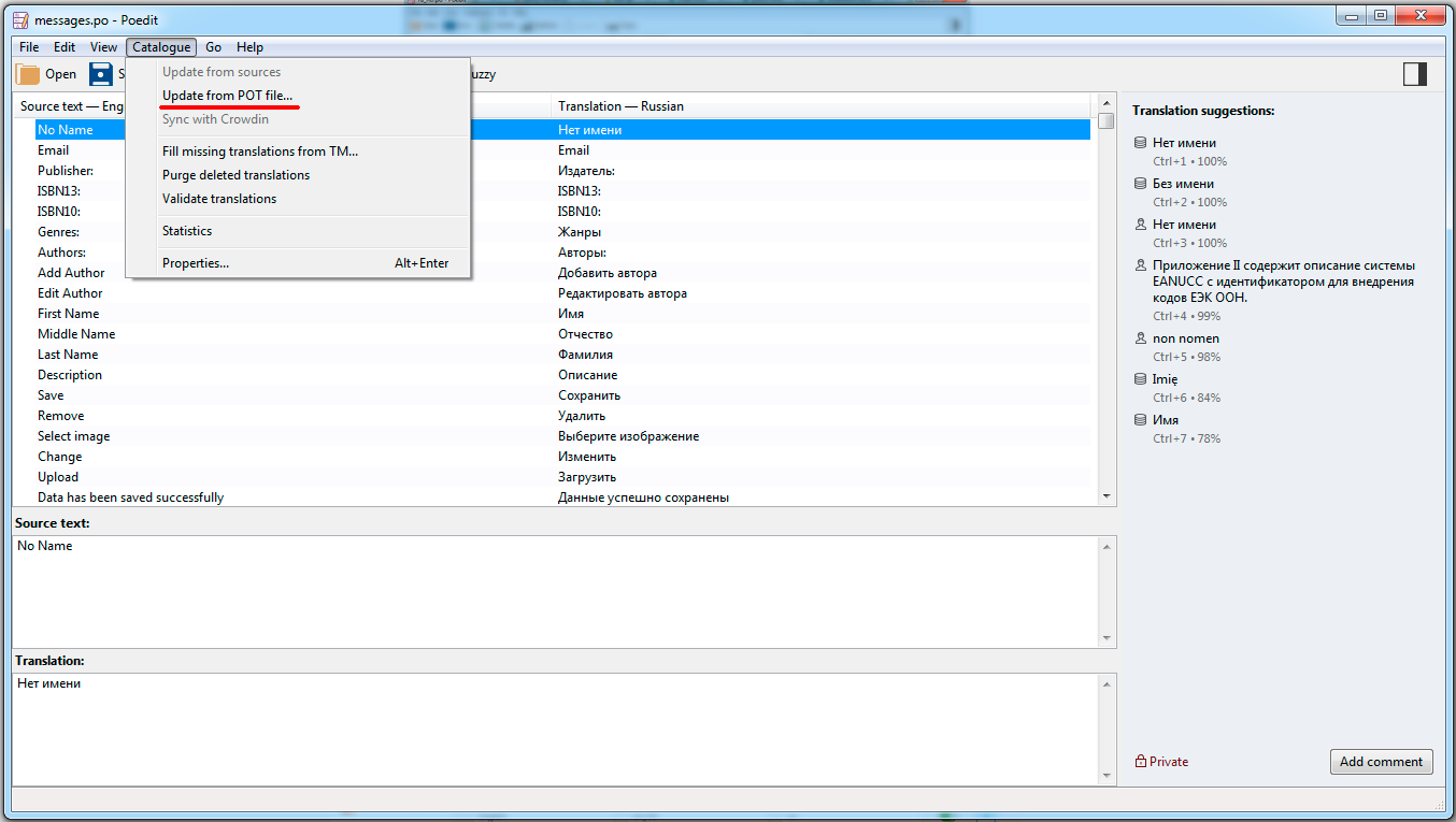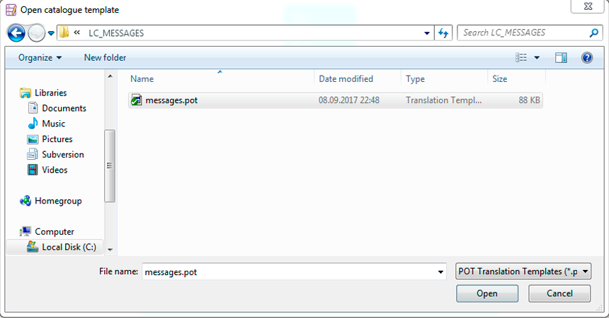 - Next thing what you should do is press File -> “New catalog from POT file…" and select in project folder locale/en/LC_MESSAGES/messages.pot.