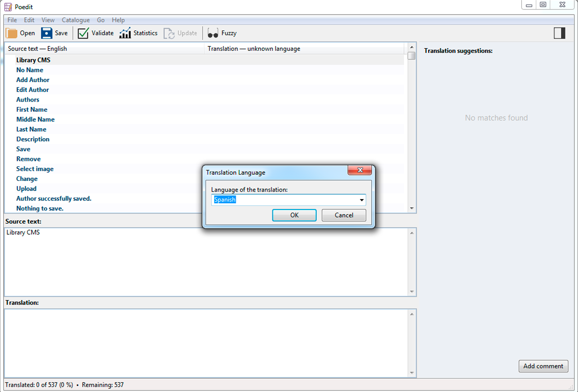 - As you can see the new translated text automatically fills up in “Translation" column. Now we need to save our translation, to do that, press "File -> Save as..". Select the folder where to save the file, name the file and click Save. Language file should be saved as messages.po in folder "locale/ISO Language Codes + _ + ISO Country Codes/LC_MESSAGES" (for example: en_US) (you can find examples in "locale" folder)