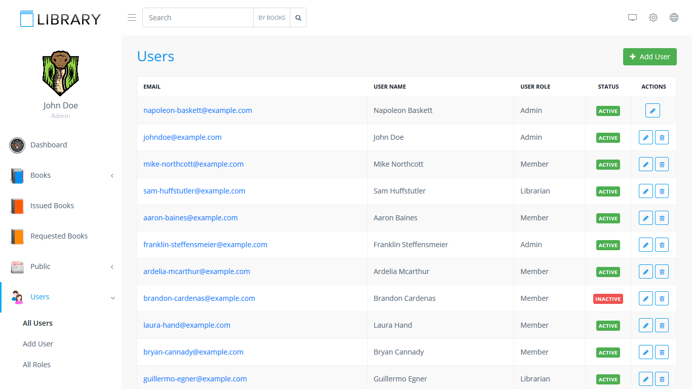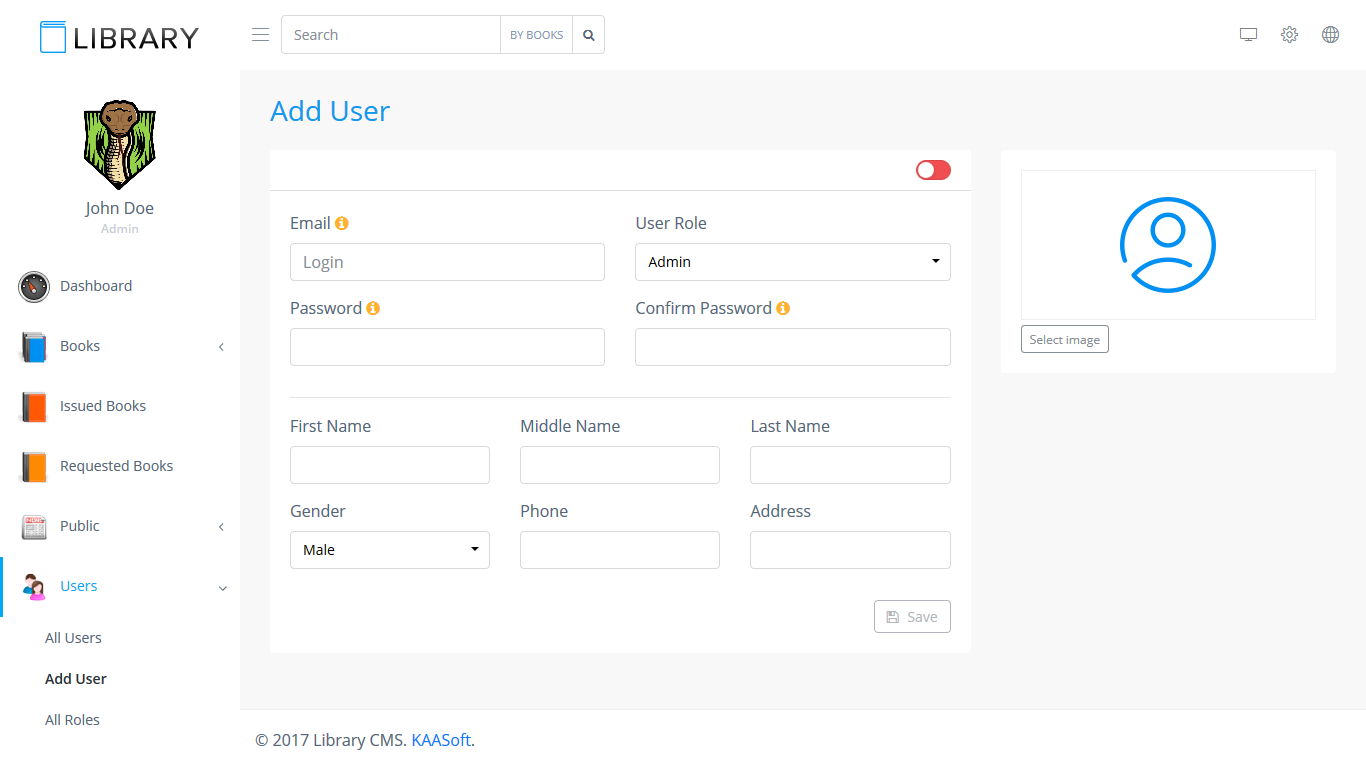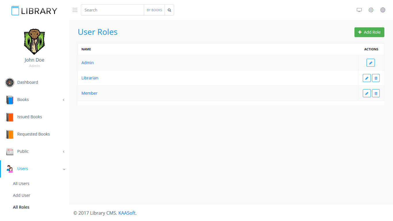 This page helps you with creation/edition user roles. As described above each user role has a number of permissions. Enabling permission in role means you provide access to specific page for each user who has this role. Also user have some additional properties like:- Issue day limit – how much days user can get book without penalty.
